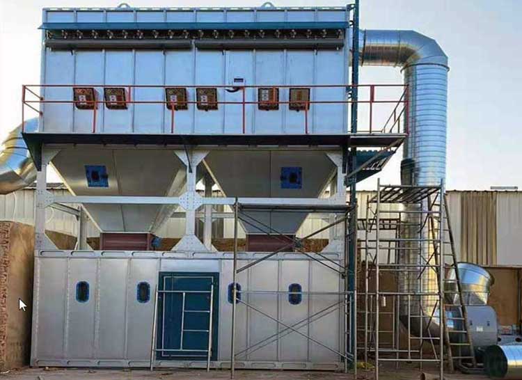 中央除塵設備是將含有木屑顆粒的氣流經過風機運輸送至布袋過濾器的導流倉中,氣流在導流板的作用下流速降低,較重的木屑顆粒在重力的作用下落入惠倉里,其中較輕細的粉塵隨氣流向上吸附在濾袋的外表層面上,經過布袋的過濾后,干凈的氣體進入排風室中并排到外面。隨著過濾工況的持續,積累在濾袋外表面上的粉塵會越來越多,就會增加系統的運動阻力,降低系統的除塵效率。脈沖幅度和頻率設定完成后,在工作的過程中,系統會自動完成過濾布袋的清灰,從而大大增加濾筒的過濾效率并延長過濾布袋的使用壽命。