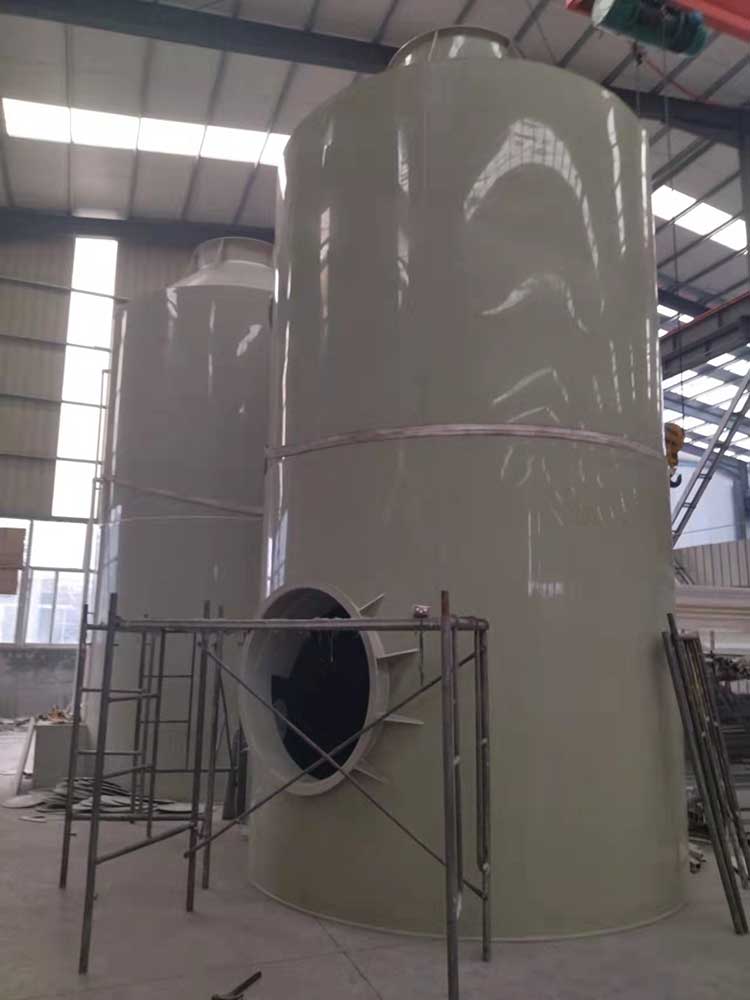 1.5萬風(fēng)量pp噴淋塔塔規(guī)格為:ф1.8m*H4.0m*10mm。進(jìn)、出風(fēng)口直徑均為600mm。循環(huán)水量每小時(shí)22立方。每小時(shí)處理廢氣量15000立方左右。凈化塔整體厚度為8mm PP板。塔體內(nèi)部有二層水噴淋裝置,三層浮球填充,帶水箱和2.2KW純銅芯普通循環(huán)水泵。